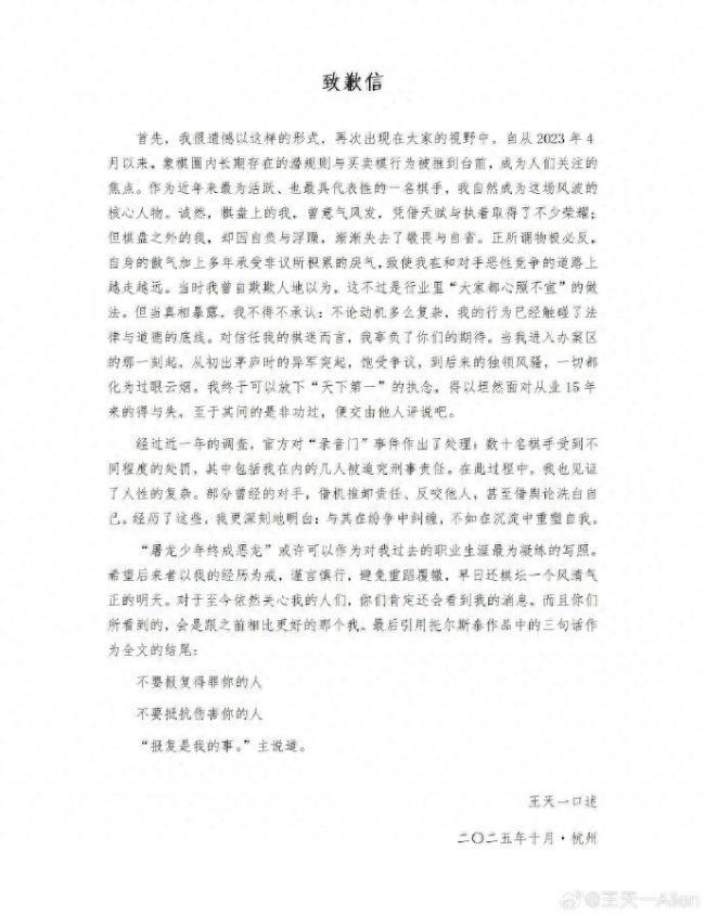 首先,我很遗憾以这样的形式,再次出现在大家的视野中。自从2023年4月以来,象棋圈内长期存在的潜规则与买卖棋行为被推到台前,成为人们关注的焦点。作为近年来最为活跃、也最具代表性的一名棋手,我自然成为这场风波的核心人物。诚然,棋盘上的我,曾意气风发,凭借天赋与执着取得了不少荣耀;但棋盘之外的我,却因自负与浮躁,渐渐失去了敬畏与自省。正所谓物极必反,自身的傲气加上多年承受非议所积累的戾气,致使我在和对手恶性竞争的道路上越走越远。当时我曾自欺欺人地以为,这不过是行业里“大家都心照不宣”的做法。但当真相暴露,我不得不承认:不论动机多么复杂,我的行为已经触碰了法律与道德的底线。对信任我的棋迷而言,我辜负了你们的期待。当我进入办案区的那一刻起,从初出茅庐时的异军突起,饱受争议,到后来的独领风骚,一切都化为过眼云烟。我终于可以放下“天下第一”的执念,得以坦然面对从业15年来的得与失,至于其间的是非功过,便交由他人评说吧。
