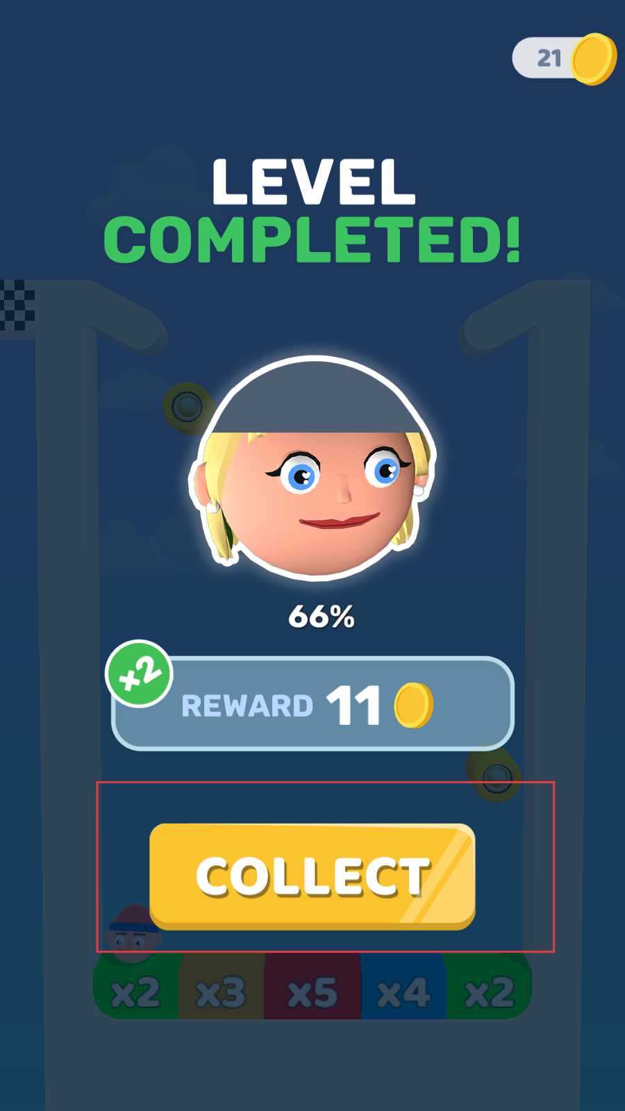 4、完成关卡后玩家可点击COLLECT按钮,领取本次关卡获得的金币等奖励,之后可以选择进入下一个关卡继续挑战。