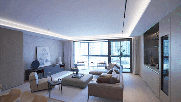 面宽7米的客厅是家庭交流的共享场域,将近70㎡尺度比肩市区顶豪300左右的户型。