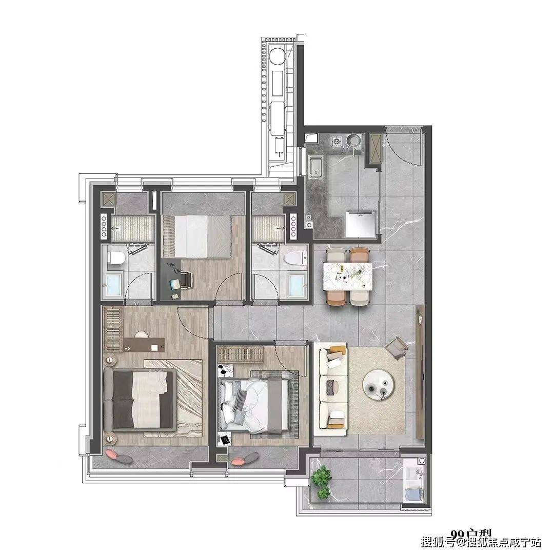 该户型贴合当代人居生活习惯,既适合三口之家小太阳家庭,也可以是三代同堂,每个人都能拥有独立空间。