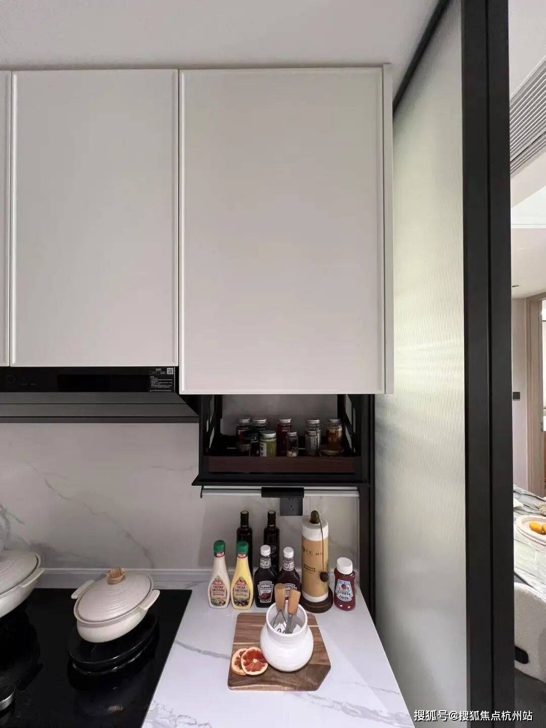 建面约97㎡样板间实拍,非最终交付标准,仅供参考灶台旁更设计了一个下拉式的调味拉篮,轻松拿放的同时,也避免油渍沾在瓶瓶罐罐上。